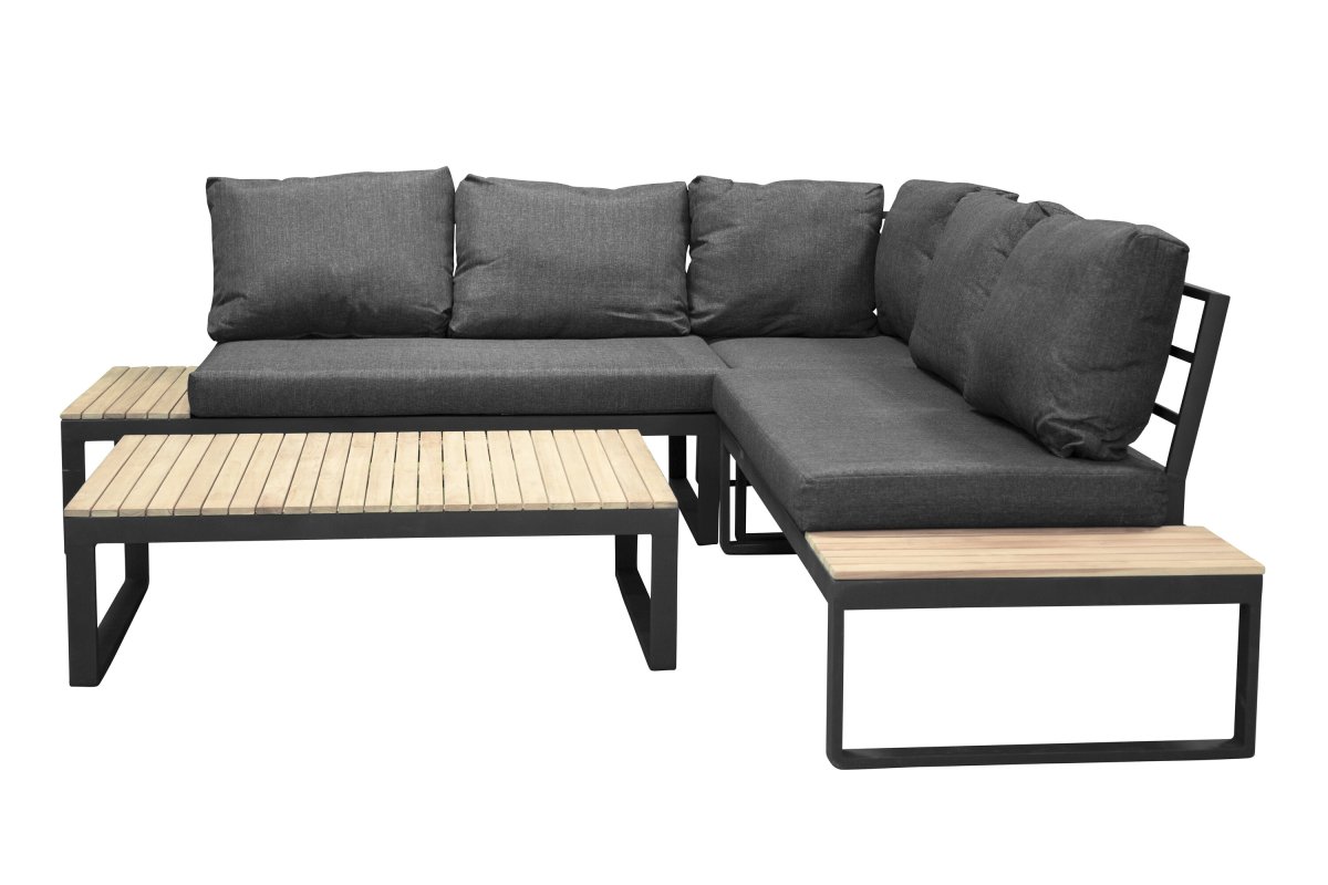 BLOOMINGVILLE Hampton hagesofa, med armlener og puter - akasietre og svart flettet snor/metall